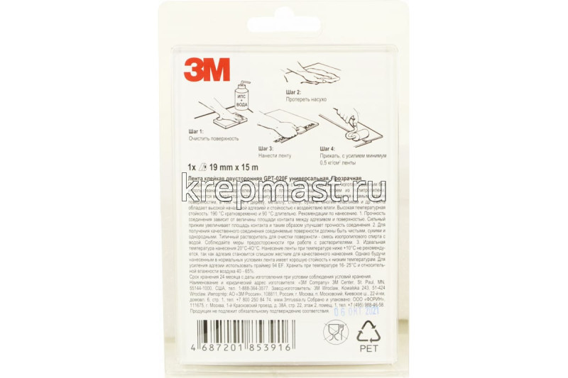 Двусторонняя лента 3М GPT-020F 19 мм х 15000 мм подходит для применения в различных областях, включая производство бытовой техники, промышленного оборудования, транспортных средств и потребительской электроники, а также изготовление вывесок. Используется для склеивания материалов с высокой поверхностной энергией, а также некоторых материалов с низкой поверхностной энергией (нержавеющая сталь, поликарбонат, алюминий, АБС-пластик, полипропилен и стекло).