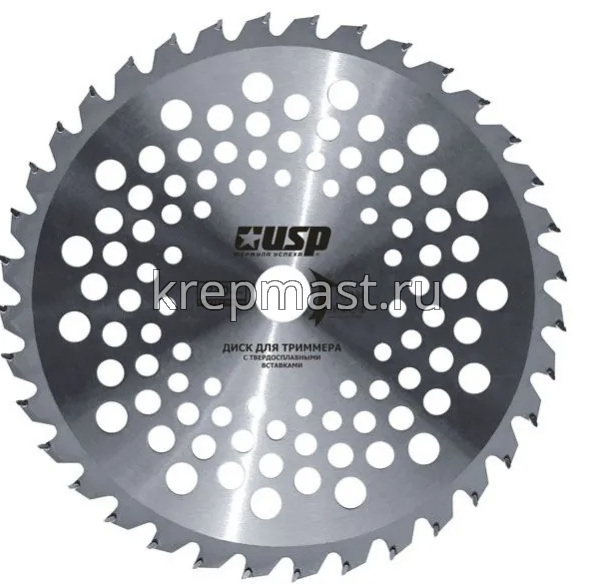 Диск для триммера USPEX твердосплавный 255х36Тх25,4мм - предназначен для скашивания зеленой и сухой травы, мелкого кустарника, а также молодой поросли деревьев при совместном использовании с триммером. Специальная форма зуба уменьшает вероятность повреждения ножа при ударе о твёрдые предметы во время работы. Каждый зуб снабжен твердосплавной вставкой для повышения износостойкости и продолжительного срока службы. Наличие перфорации облегчает вес, за счёт чего снижается уровень вибрации и продлевается рабочий ресурс триммера.