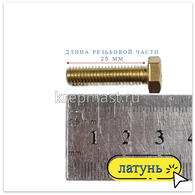 Болт 6х25 DIN 933 латунь в интернет-магазине «Мастер Крепежа» по цене 53 руб. Более 26 наименований товаров в наличии в категории Болты латунные DIN 933. Купить болт 6х25 din 933 латунь в Высокая Гора выгодно Вы можете on-line на нашем сайте, или отправив заявку по почте, а также по телефону или в пункте выдачи компании г. Казань, ул. Татарстан, 9, магазин "Мастер Крепежа". Доставка по Республике Татарстан и другие регионы РФ.