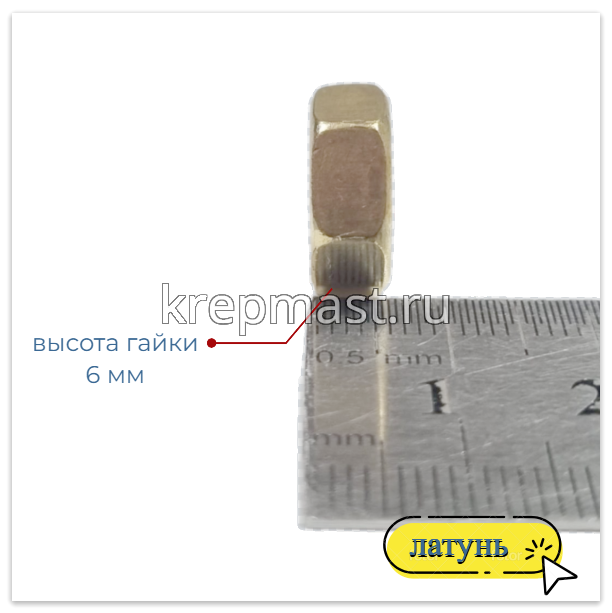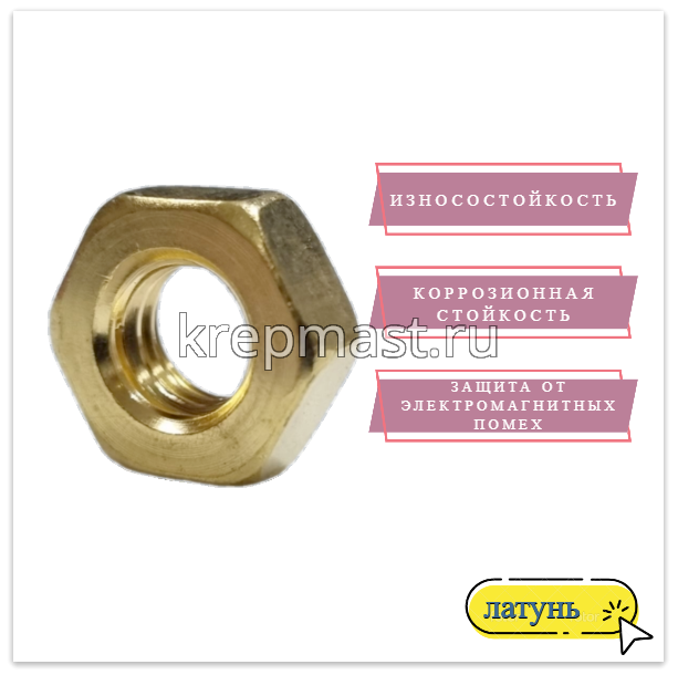 Гайка латунная не магнитится и служит для создания разъемных резьбовых соединений совместно с винтами, шпильками и болтами.