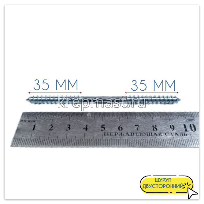 Двусторонний шуруп изготавливается из высококачественной инструментальной стали марки С10008. Для защиты от негативного воздействия влаги и появления коррозии, саморез с двухсторонней резьбой покрывается тонким слоем белого цинка (горячее цинкование).